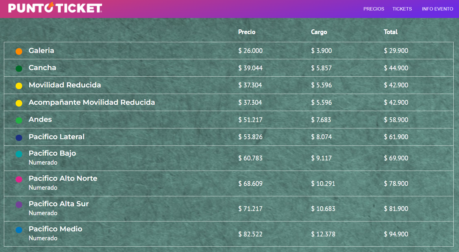 El ticket demás alto valor corresponde a la ubicación de pacífico medio y cuesta $94.900.