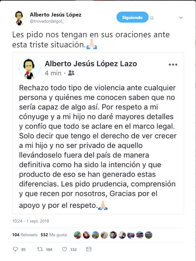 Para luego agregar que "tengo el derecho de ver crecer a mi hijo y no ser privado de aquello llevándoselo fuera del país de manera definitiva como ha sido la intención y que producto de eso se han generado estas diferencias".