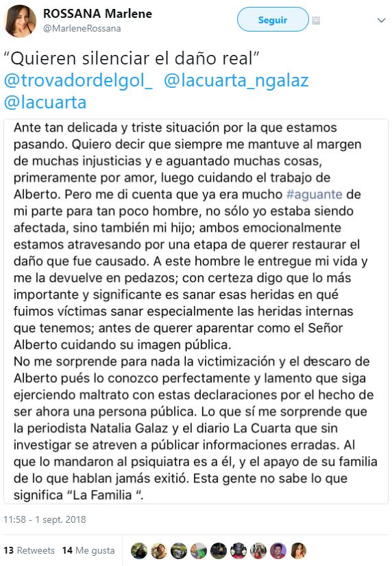 Luego agregó que "no me sorprende para nada la victimización y el descaro de Alberto pues lo conozco perfectamente (...) Al que mandaron al psiquiatra fue a él y el apoyo de su familia jamás existió. Esta gente no sabe lo que significa "La Familia".