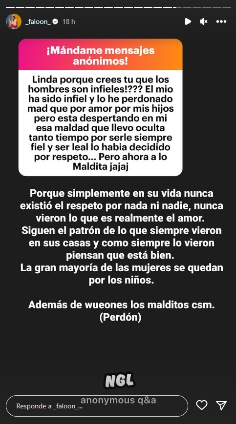 crees que los hombres son infieles?", señaló esta persona, asegurando que vivió en carne propia esta situación y que solamente había perdonado a su pareja por el amor que le tiene a sus hijos.