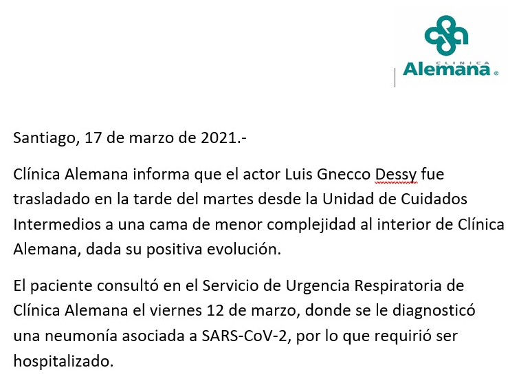 El actor nacional, que dio positivo por coronavirus e ingresó a la Clínica Alemana el viernes 12, fue trasladado desde la Unidad de Cuidados Intermedios a una cama de menor complejidad, según informaron desde el recinto médico.
