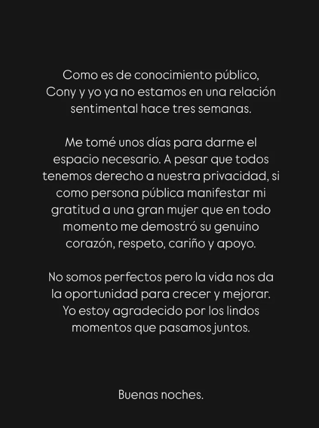 A través de su cuenta de Instagram, Luis Miguel escribió en sus historias: "Como es de conocimiento público, Cony y yo ya no estamos en una relación sentimental hace tres semanas".