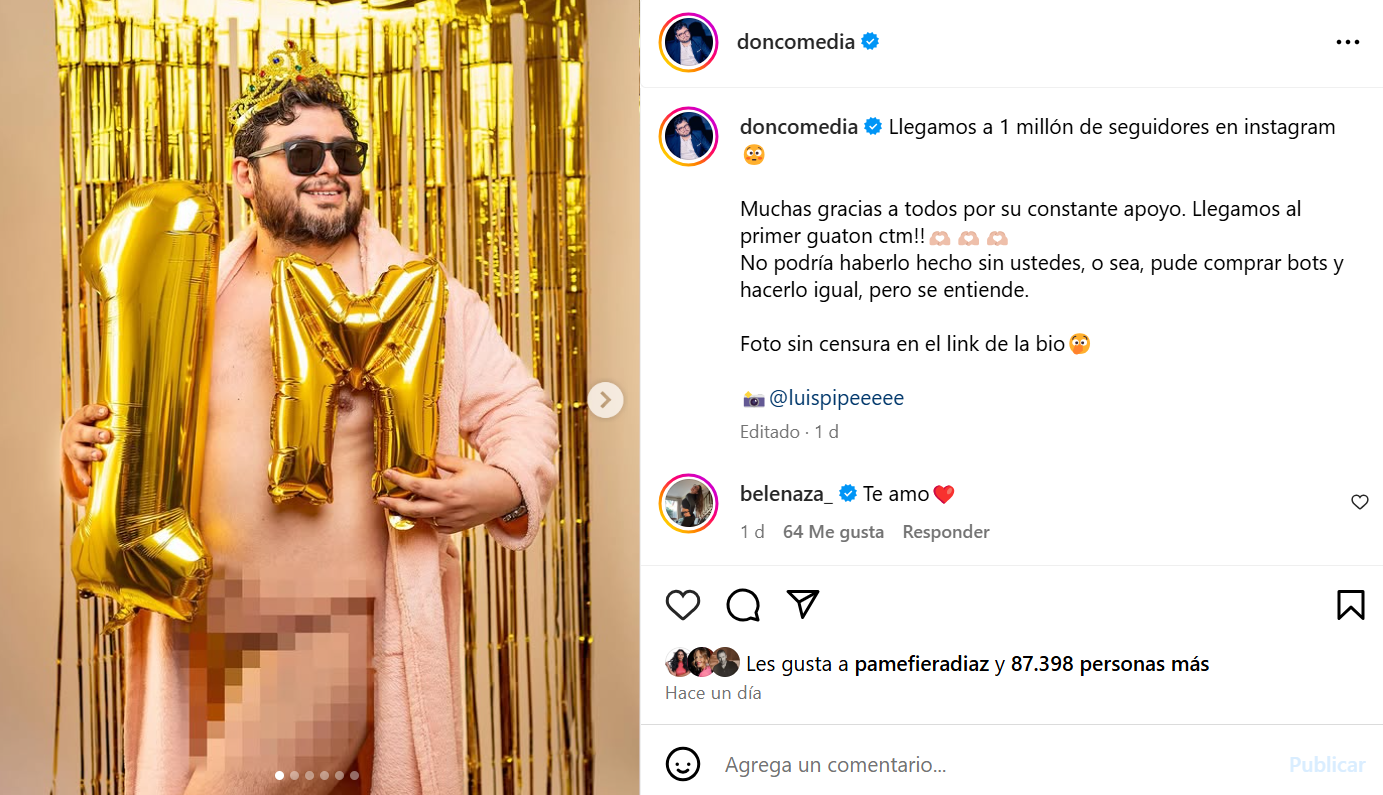 El comediante llegó al millón de seguidores de Instagram y lo celebró con una destapada sesión de fotos. "No lo pensamos mucho, pero funcionó bastante bien", afirmó.
