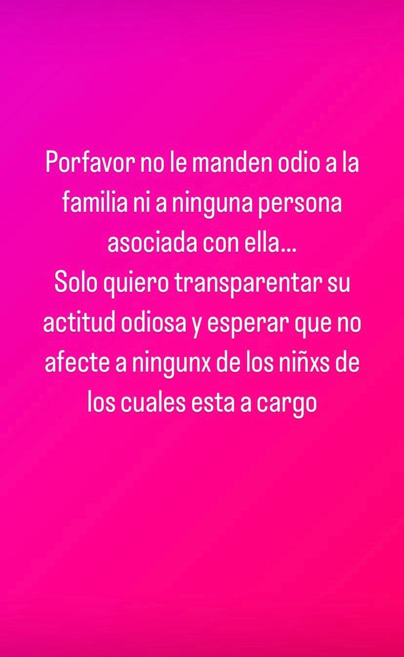 Pero pese a los ataques, la actriz hizo un llamado a no escribirle ni amedrentar a las personas cercanas de la usuaria. "Por favor no le manden odio a la familia y a ninguna persona relacionada con ella", dijo la intérprete.