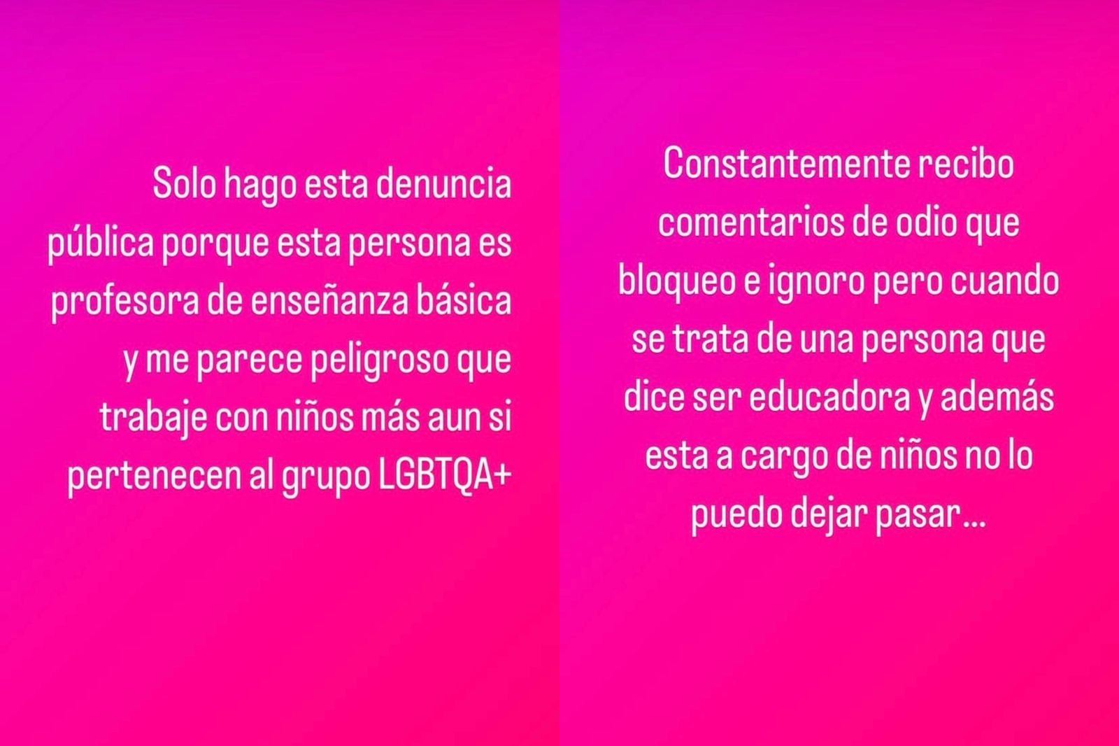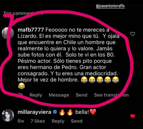 "Feooo, no te mereces a Lizardo (su pareja). El es mejor mino que tu y ojalá que encuentre en Chile a un hombre que lo quiera y lo valore (sic)", le escribió la usuaria de Instagram, quien además se desempeña como profesora de educación básica, según pudo constatar Lux.