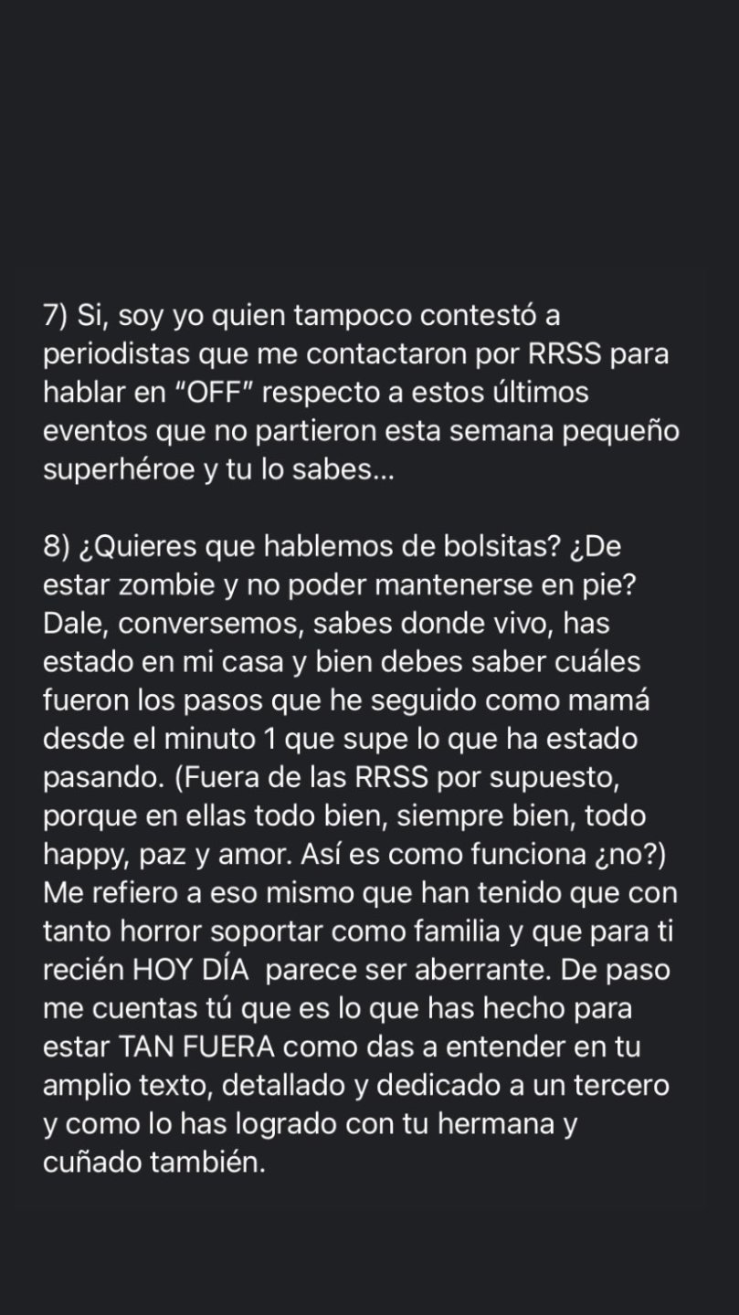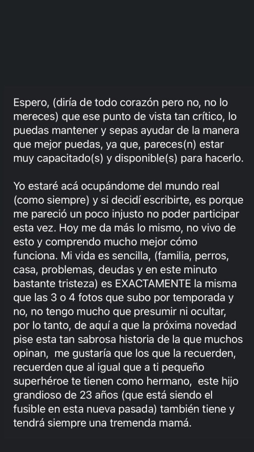 "Carta abierta a ti, pequeño superhéroe. Dado que parece que no lo recuerdas bien, haremos un recuento", partió diciendo la madre de Diego Jiménez en sus stories.