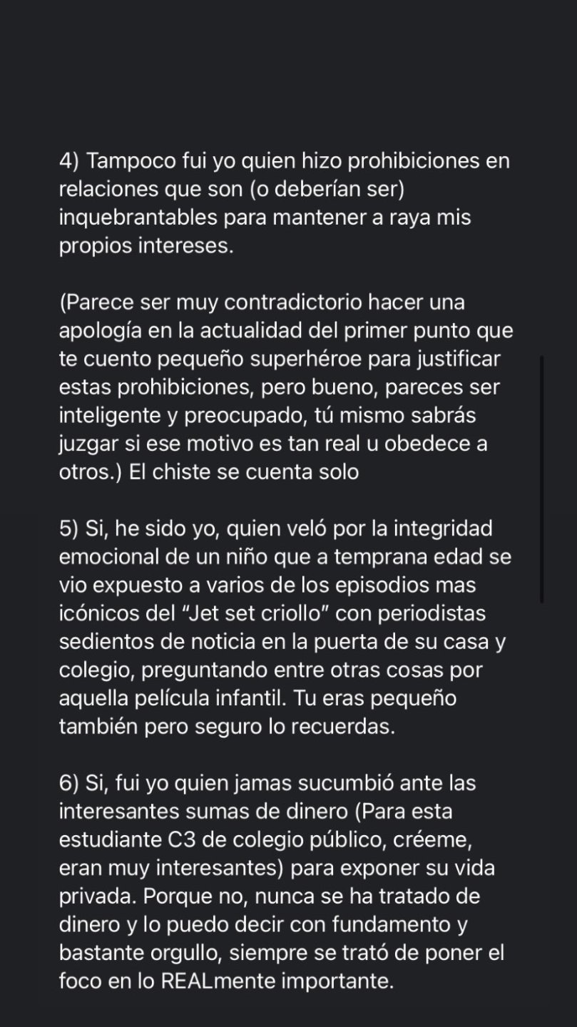"Sí, he sido yo quien veló por la integridad emocional de un niño que a temprana edad se vio expuesto a varios de los episodios más icónicos del 'jet set criollo' con periodistas sedientos de noticia en la puerta de su casa y colegio", agregó después.
