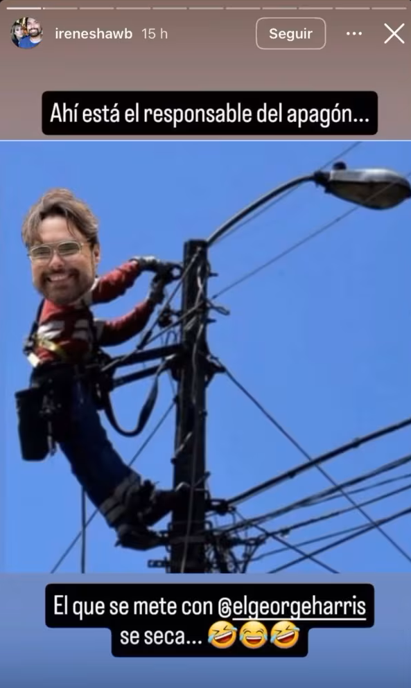 En otra postal que compartió Irina Shaw aparece el rostro del humorista venezolano en montaje de un hombre cortando la luz. "Ahí está el responsable del apagón... El que se mete con George Harris se seca", escribió.
