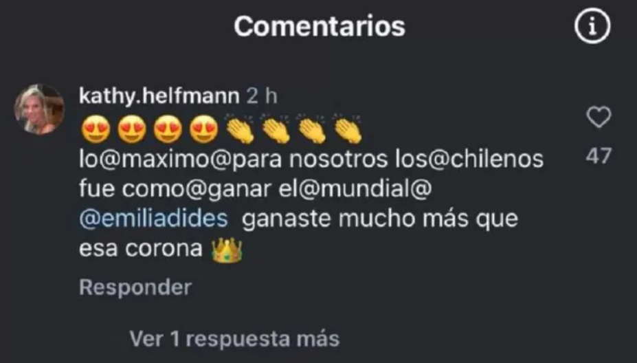 "¡Lo máximo para nosotros, los chilenos! Fue como ganar el mundial, Emilia Dides", señaló Katherine a través de la red social Instagram.