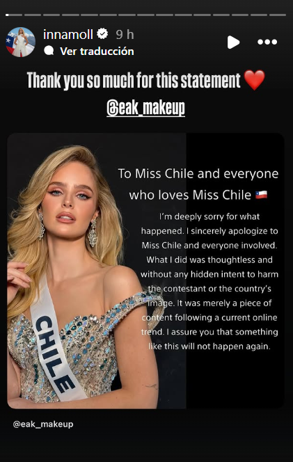 “Para Miss Chile y todos los que aman Miss Chile. Siento profundamente lo que pasó. Me disculpo sinceramente con ella y todos los involucrados”, expresó a través de su Instagram.