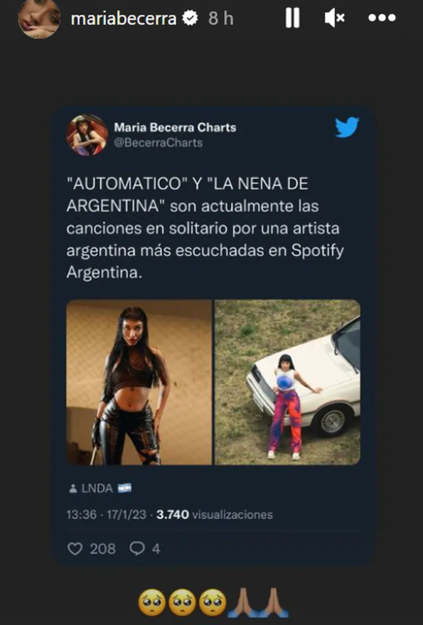 Sumado a lo anterior, al cierre del 2023 desde Spotify reconocieron a Maria Becerra como la artista argentina más escuchada por tercer año consecutivo.