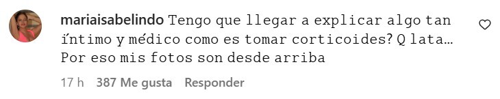 "¿Tengo que llegar a explicar algo tan íntimo y médico como es tomar corticoides? Que lata... por eso mis fotos son desde arriba" , explicó.