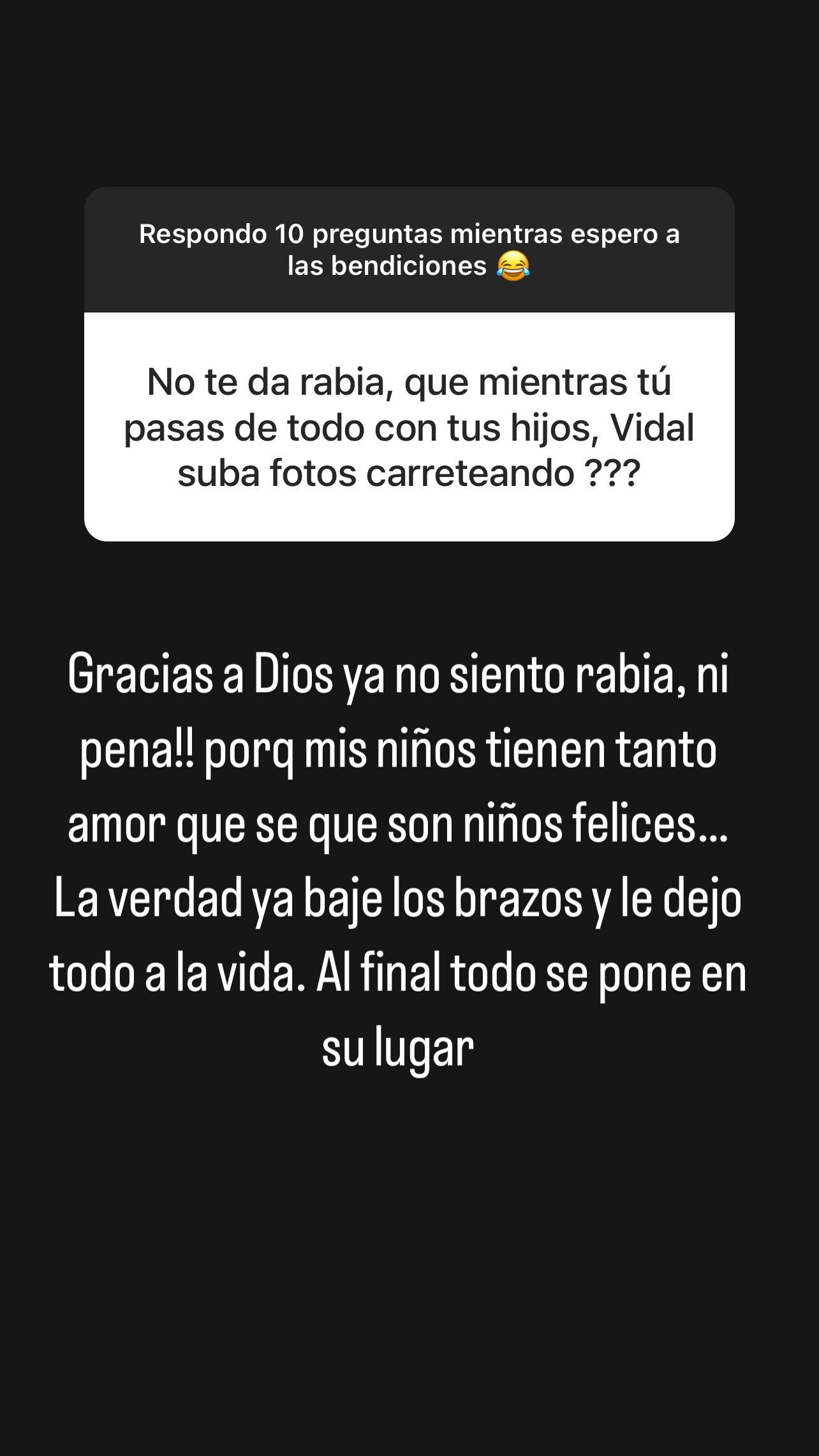 Posteriormente, otro usuario le preguntó "¿No te da rabia que, mientras tú pasas de todo con tus hijos, Vidal suba fotos carreteando?", a lo cual contestó: "Gracias a Dios ya no siento rabia ni pena".