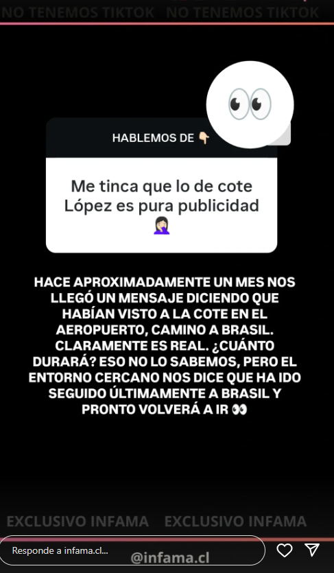 Frente a esto, el medio InFama señaló que "hace aproximadamente un mes nos llegó un mensaje diciendo que habían visto a la Cote en el aeropuerto, camino a Brasil".