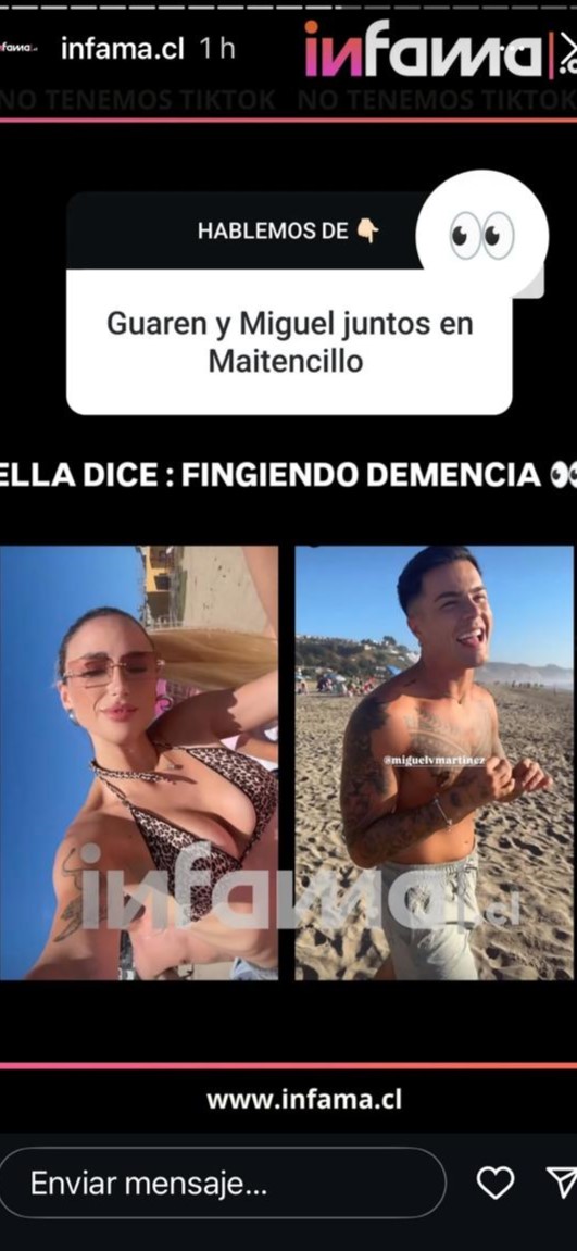 La información fue recopilada por Infama, puesto que uno de sus seguidores mencionó a través de Instagram: "Guarén y Miguel juntos en Maitencillo". Al respecto, el portal contestó: "Ella (Guarén): Fingiendo demencia".