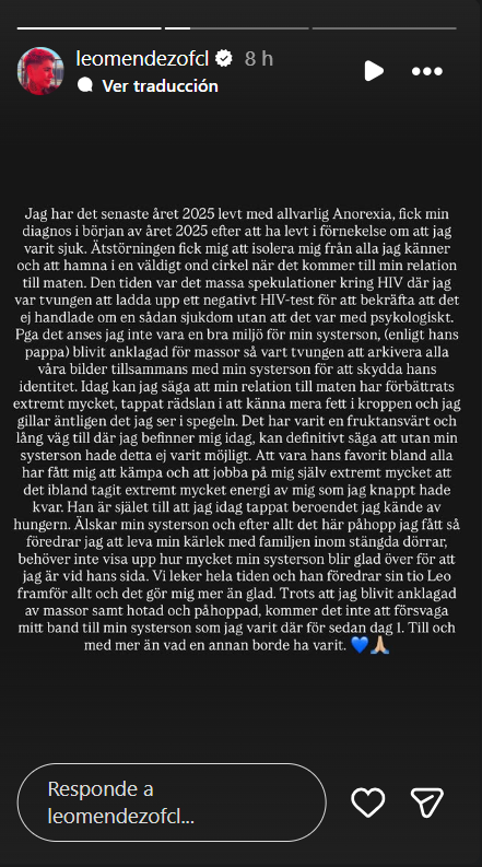 A través de Instagram, Leo comentó: "He vivido con anorexia severa durante el 2025. Recibí mi diagnóstico a principios de este año, tras negar que estaba enfermo".