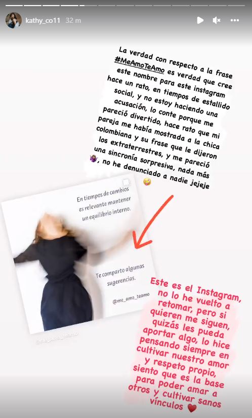 En relación a ella, Kathy Contreras evidenció una situación que denominó como "sincronía sorpresiva", ya que a través de sus historias mostró un canal de Youtube y un perfil en Instagram -de su autoría- que se llama "MeAmoTeAmo".