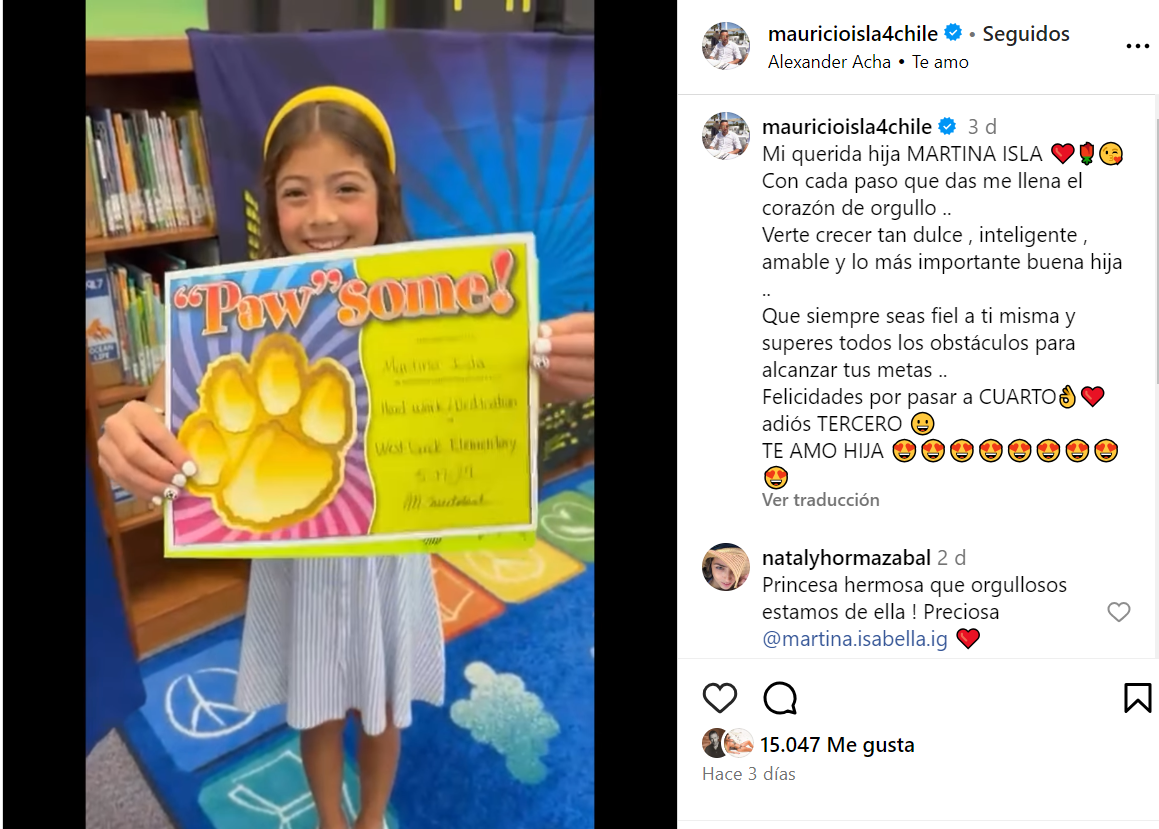 Mauricio Isla celebró a través de sus redes sociales el triunfo académico de su hija mayor, Martina Isla, quien pasó a cuarto básico.