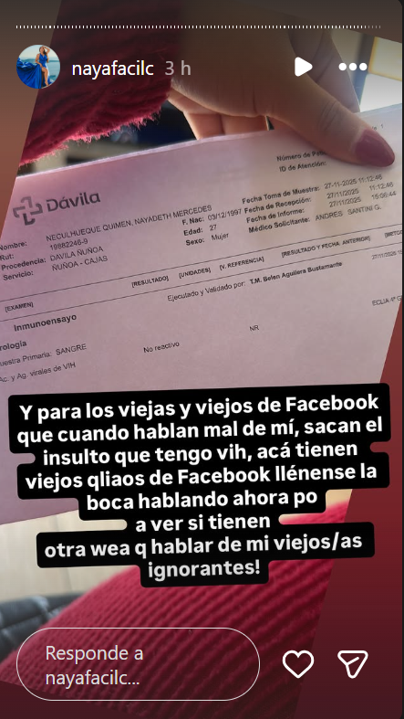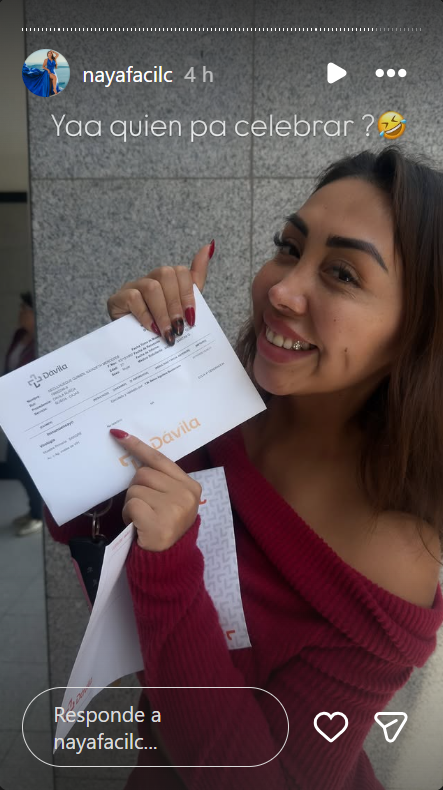 "Vengo saliendo de la clínica. Me hice el examen del VIH para ver, como chequeo, por supuesto y aquí lo tenemos ¿Qué dice aquí? No reactivo ¡Estamos sanitas!", expresó Naya en las historias de su cuenta de Instagram y mostró el examen a la cámara.