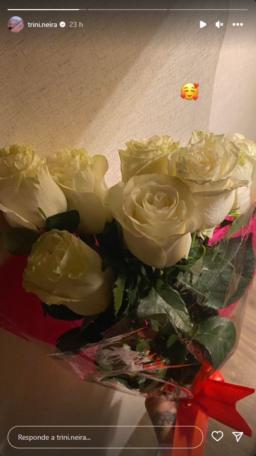 Se trata de un delicado ramo de rosas blancas que le regaló Bastián, historia a la cual sumó una imagen que se tomó junto a su pololo en el especio de un ascensor, mientras él le daba un beso en la mejilla. "Mi lugar feliz", escribió en la storie.