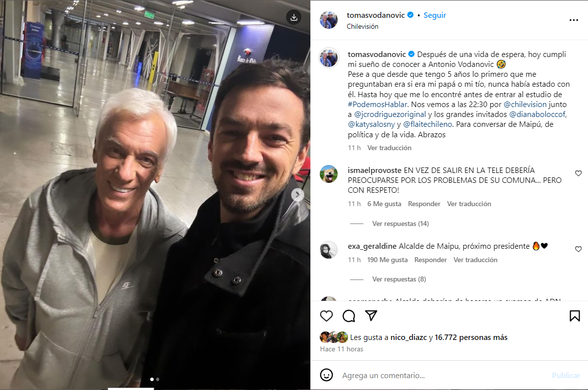 Después de una vida de espera, hoy cumplí mi sueño de conocer a Antonio Vodanovic", comentó la autoridad maipucina junto a una fotografía con el presentador, a quien se encontró en los pasillos de