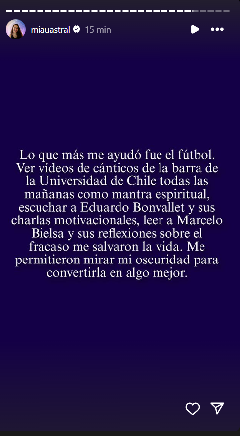 Asimismo, definió quiénes fueron específicamente las figuras que la mantuvieron a flote: “Escuchar a Eduardo Bonvallet y sus charlas motivacionales, leer a Marcelo Bielsa y sus reflexiones sobre el fracaso me salvaron la vida”.