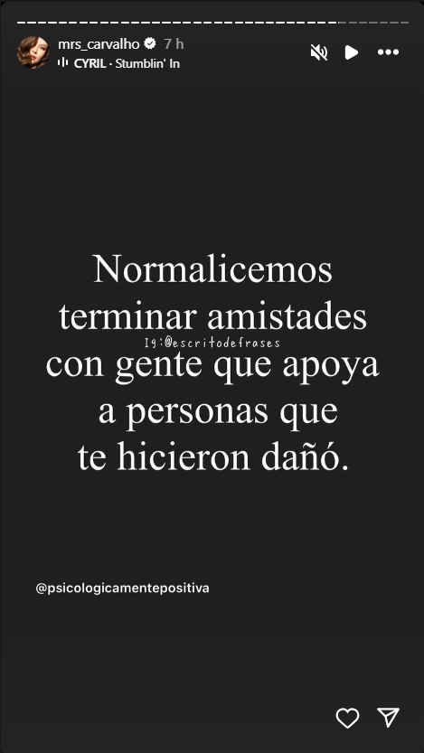 En esa línea, además de acaparar titulares por aquello, también lo ha hecho por publicaciones que ha realizado en sus plataformas, como la que publicó este lunes y que dice "normalicemos terminar amistades con gente que apoya a personas que te hicieron daño".