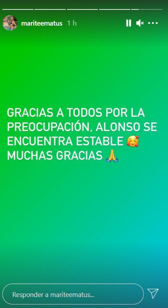 Lee también: Capítulos de estreno: Los invitados e invitadas de esta semana en "Podemos Hablar" y "La Divina Comida"María Teresa Matus, madre de Alonso Vidal, también se sumó a las palabras de tranquilidad para los internautas. Según explicó, "Alonso se encuentra estable". Junto con eso, envió sus agradecimientos "a todos por su preocupación".