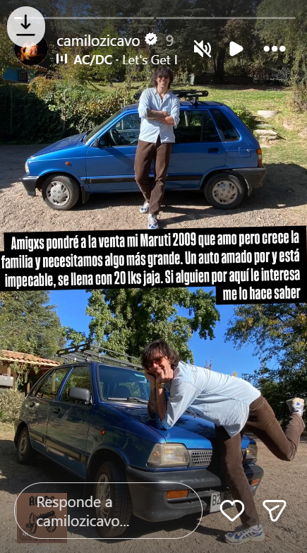 "Amigos pondré a la venta mi Maruti 2009 que amo, pero crece la familia y necesitamos algo más grande. Un auto amado por mí y está impecable", expresó Zicavo en su cuenta de Instagram, respecto de las razones para vender el vehículo.