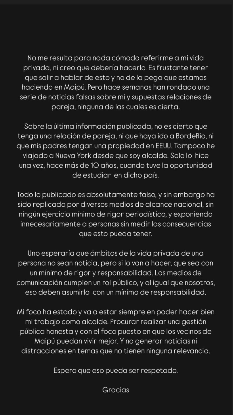 A través de una historia de Instagram, el alcalde de Maipú descartó estar en una relación de pareja con una comunicadora.