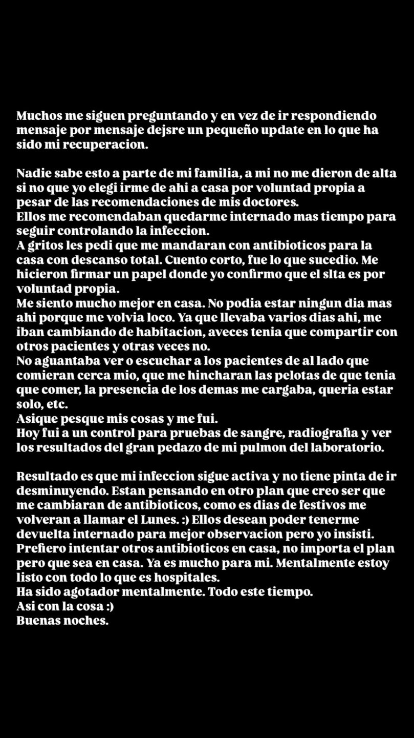 A través de su comunicado en su cuenta de Instagram, Leo reveló: "Nadie sabe esto aparte de mi familia, a mí no me dieron de alta, sino que yo elegí irme de ahí a casa por voluntad propia, a pesar de las recomendaciones de mis doctores"