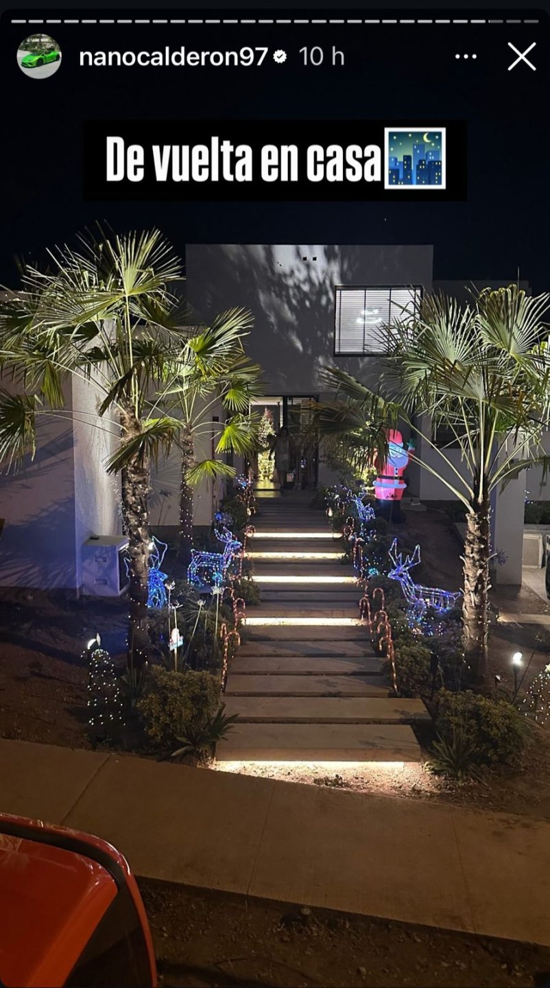 "De vuelta en casa", escribió Calderón al volver del viaje y retrató la entrada de su casa, que cuenta con una gran cantidad de luces que también rodean los troncos de las palmeras presentes en el lugar.