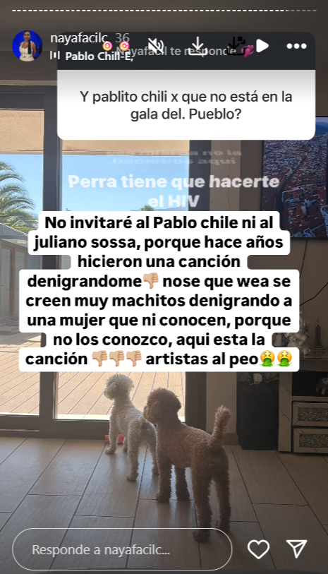 En una caja de preguntas por redes sociales, un usuario le preguntó a Naya el motivo por el que Pablo Chill-E no había sido confirmado aún para la Gala del Pueblo, duda que se había estado repitiendo en los posteos de otros invitados.