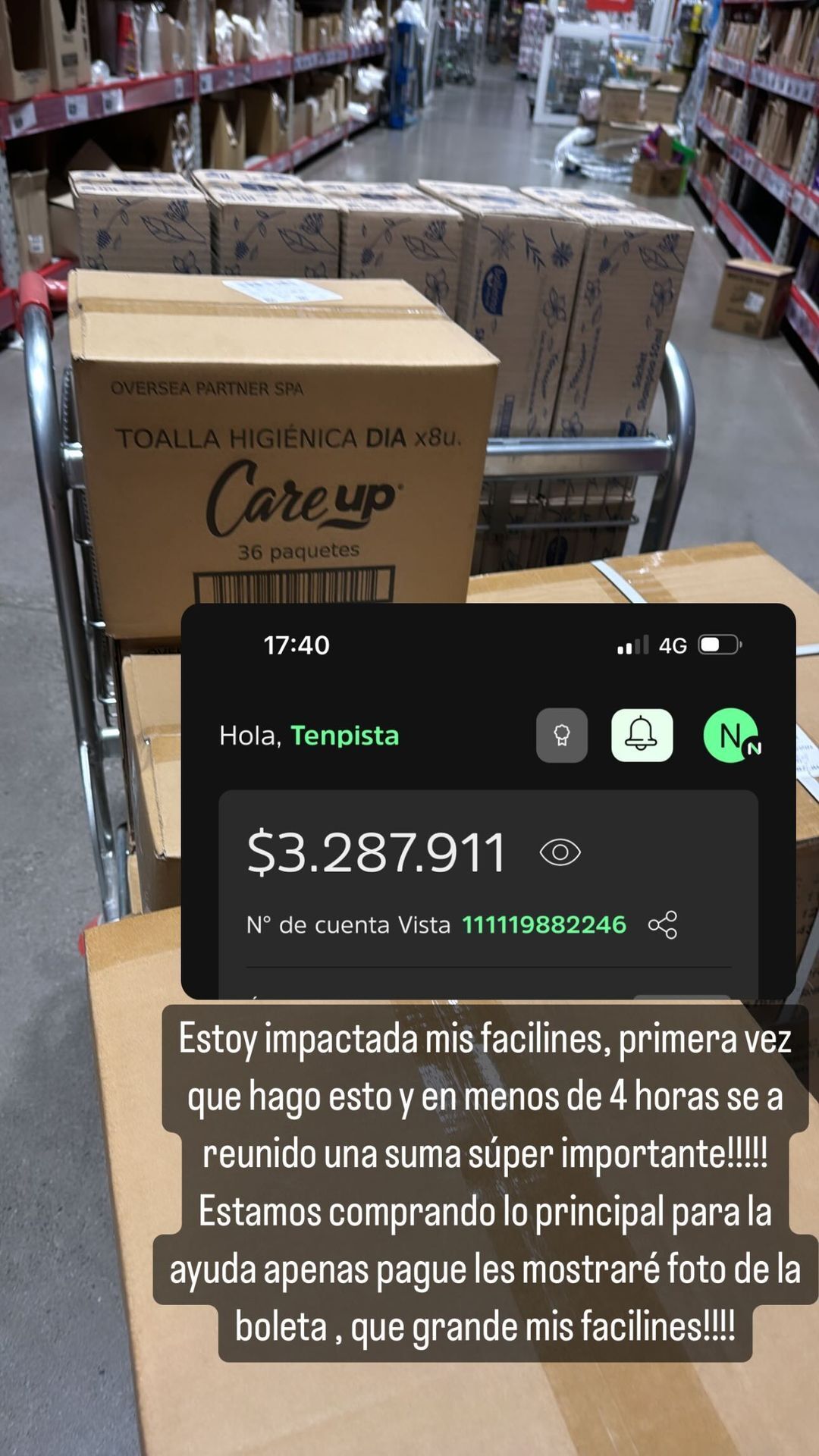 Su público no decepcionó y tal como Naya Fácil anunció en su cuenta de Instagram, lograron reunir un millonario monto en menos de 4 horas. “Estoy impactada mis facilines, primera vez que hago esto y en menos de 4 hora se ha reunido una suma súper importante. Estamos comprando lo principal para la ayuda. Apena pague les mostraré foto de la boleta. ¡Qué grandes mis facilines!”, detalló. La joven acompañó el mensaje con una foto de la suma reunida por sus seguidores en su cuenta bancaria, la que ascendió a un total de $3.287.911.