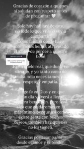 “Como familia, desde hace unos meses hemos atravesado el dolor de perder a nuestro bebé. Es un duelo real, que duele en silencio. Y yo, tanto como mi familia, solo necesitamos paz, respeto y empatía”, agregó.