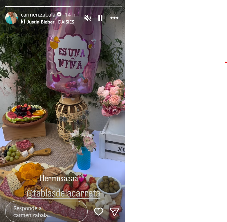 La actriz subió a sus historias un registro del festejo en el que muestra la decoración y la comida que había en el festejo, junto a un globo rosado en el que se puede ver el mensaje “es niña”.