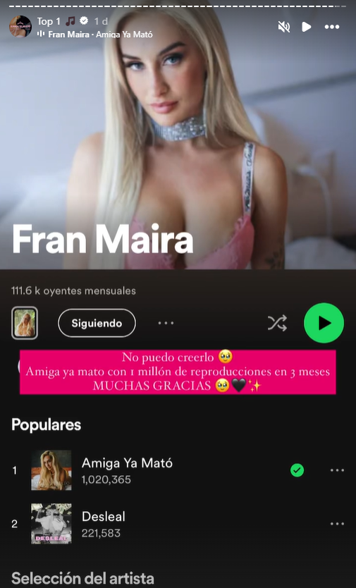 Con una historia en su Instagram, Fran reconoció que "no puedo creerlo" y adjuntó una captura de pantalla que evidencia esta cifra, posicionándose como unos de los singles favoritos en la actualidad.