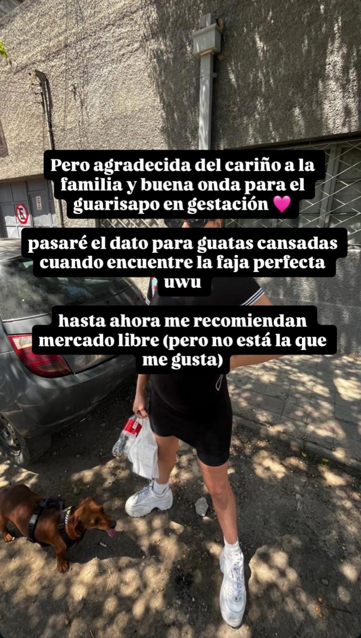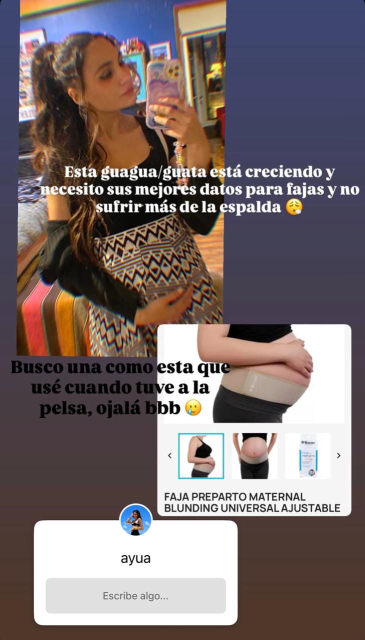 Pérez había utilizado sus historias de Instagram para pedir consejos sobre fajas maternales: "Esta guagua está creciendo y necesito sus mejores datos para fajas y no sufrir más de la espalda".