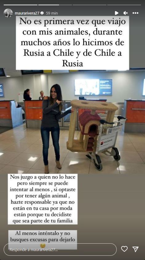siempre ha decidido viajar con sus perros Black y Simba, y sus gatos Tom y Benito. "No es primera vez que viajo con mis animales", partió diciendo.
