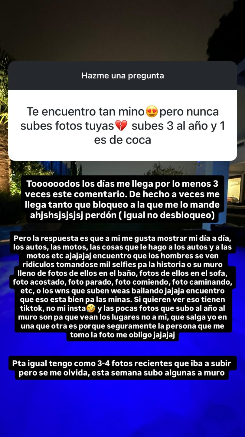 Sus seguidores destacaron sus respuestas irónicas y bromearon al respecto; sin embargo, minutos más tarde, otra persona sentenció: "Te encuentro tan mino, pero nunca subes fotos tuyas. Subes tres al año y una es de coca (su perrita)".