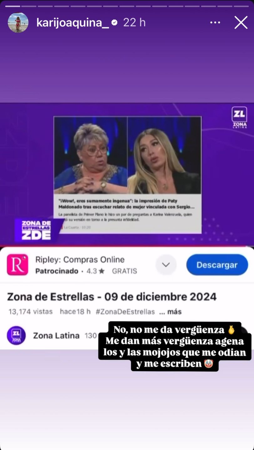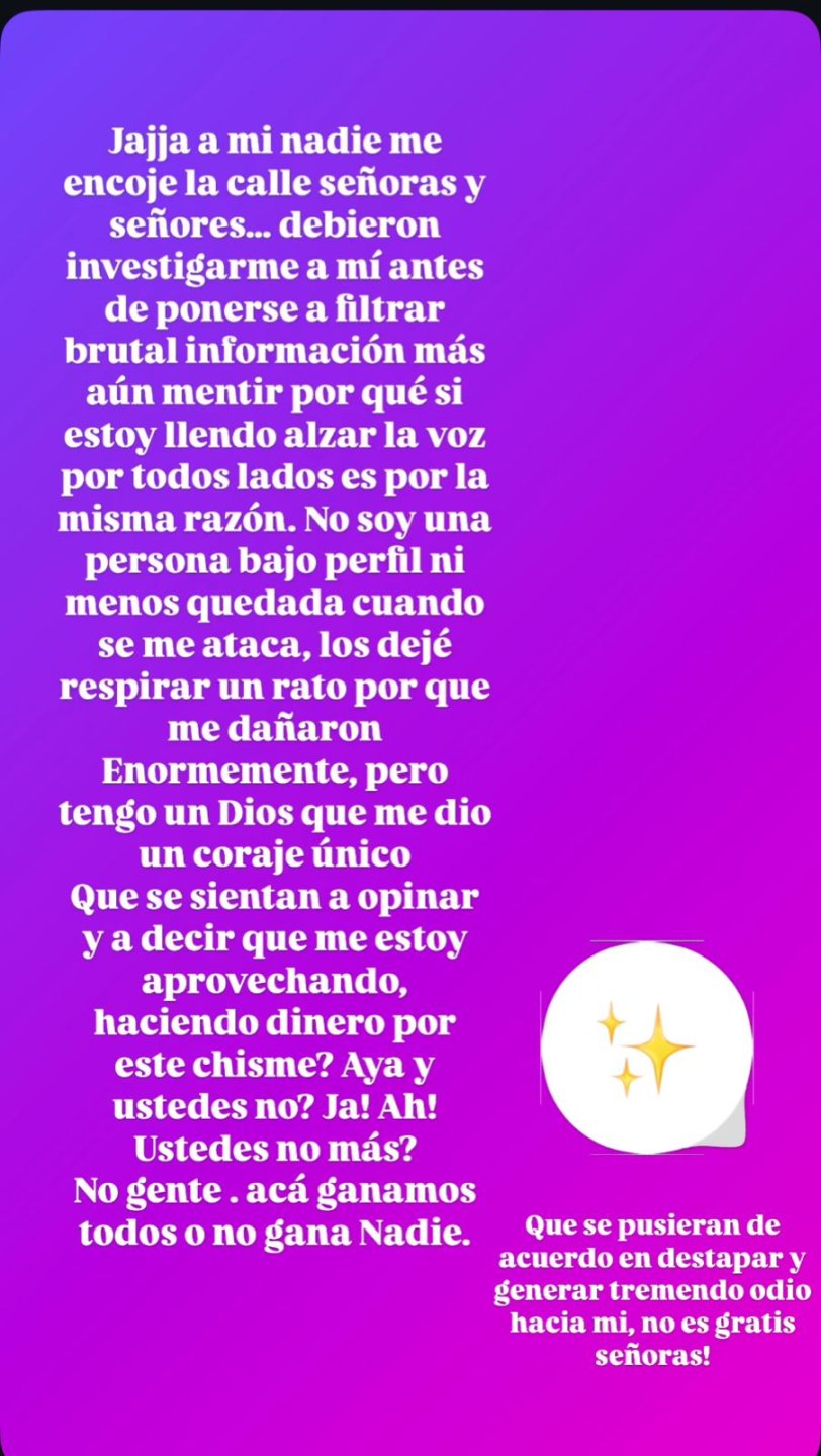 Es por ello que Karina señaló en sus historias de Instagram: "No soy una persona bajo perfil, ni menos callada cuando se me ataca. Los dejé respirar un rato porque me dañaron enormemente".