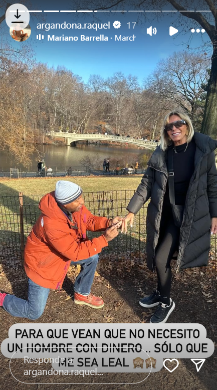 En esta oportunidad, Argandoña se encontraba en el Central Park, donde grabó un video en el que señaló: "Estamos en el Central Park, salió el sol (...) y acá está el puente en que a uno le proponen matrimonio".