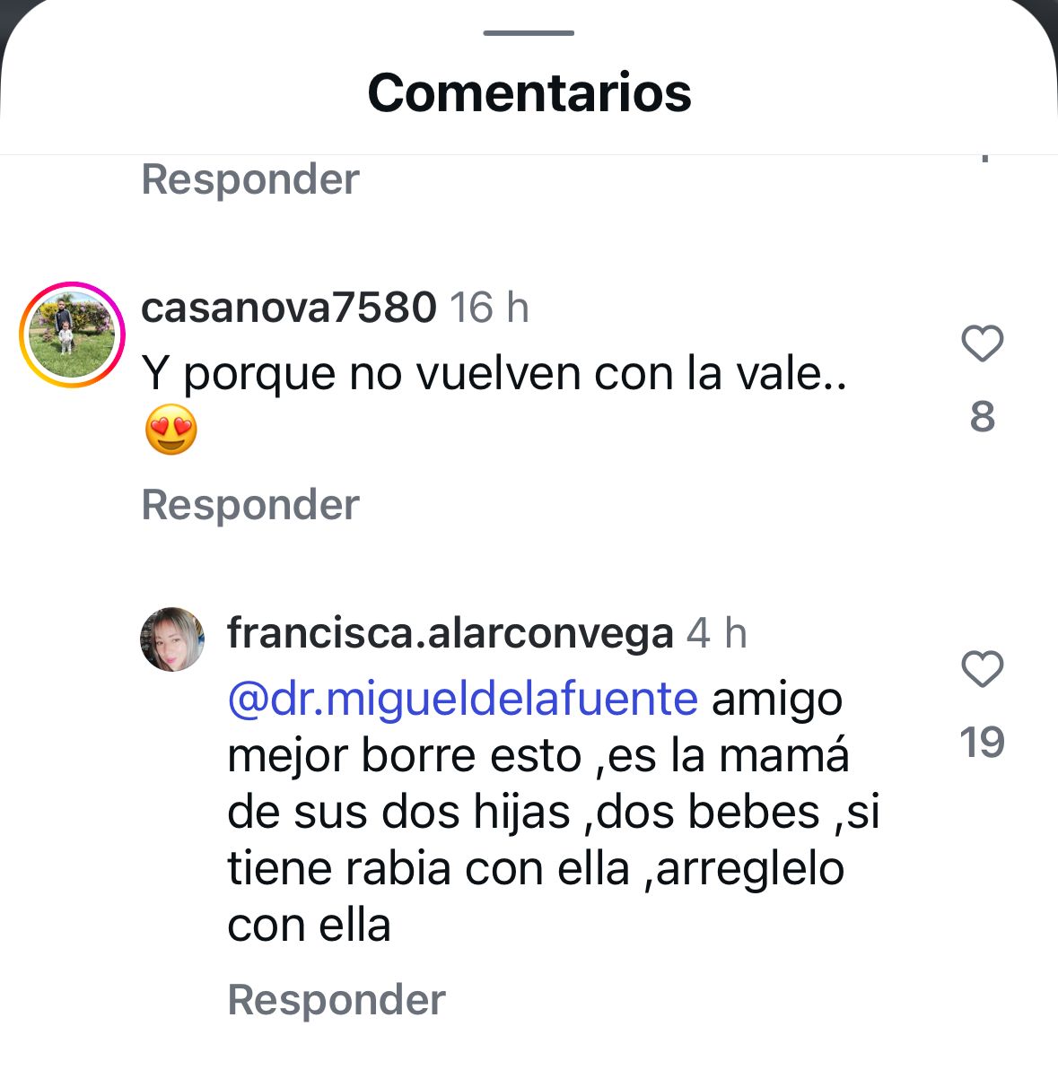 A través de su cuenta de Instagram, una usuaria le comentó a Miguel: "¿Y por qué no vuelven con la Vale?", acompañado de un emoji de carita enamorada.