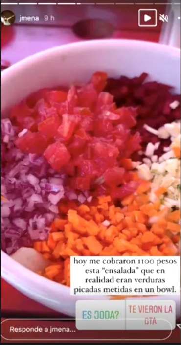 “Hoy me cobraron 1.100 pesos (argentinos) por esta ‘ensalada’ que en realidad eran verduras picadas metidas en un bowl”, señaló Barón en una historia de Instagram que transformó en encuesta con dos opciones.