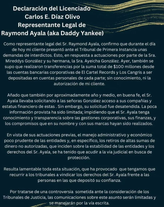 Este sábado se dio a conocer que Daddy Yankee interpuso una demanda de interdictos en contra su esposa Mireddys González y su hermana, Ayeicha González, por transferencias de 100 millones de dólares no autorizadas.