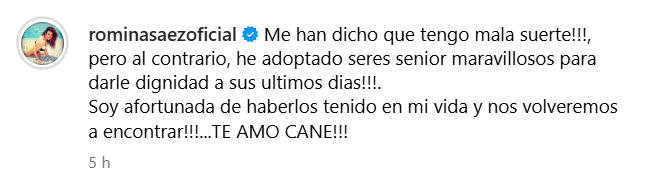 A través de su cuenta de Instagram, Sáez publicó una fotografía de su perrita y escribió: "Me han dicho que tengo mala suerte, pero al contrario, he adoptado seres senior maravillosos para darle dignidad a sus últimos días".