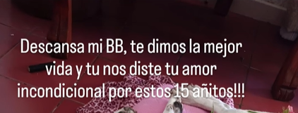 En esa misma línea, agregó: "Soy afortunada de haberlos tenido en mi vida y nos volveremos a encontrar. ¡Te amo, Cane! Descansa, mi bebé. Te dimos la mejor vida y tú nos diste tu amor incondicional por estos 15 añitos".