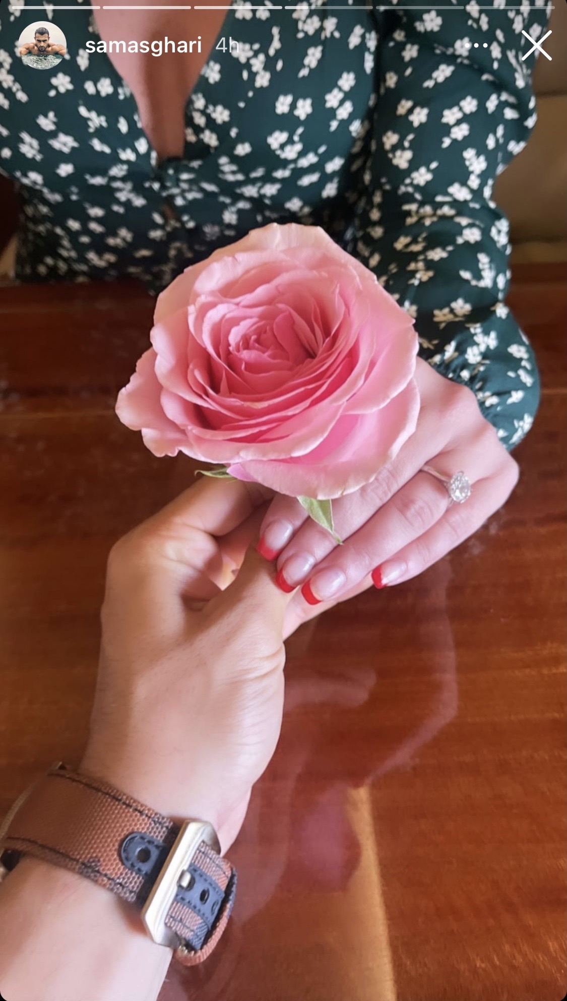 Posteriormente, puso una foto en la que aparece tomando una flor junto a la mano de su prometida, mostrando el anillo que revela los planes de matrimonios entre ambos.