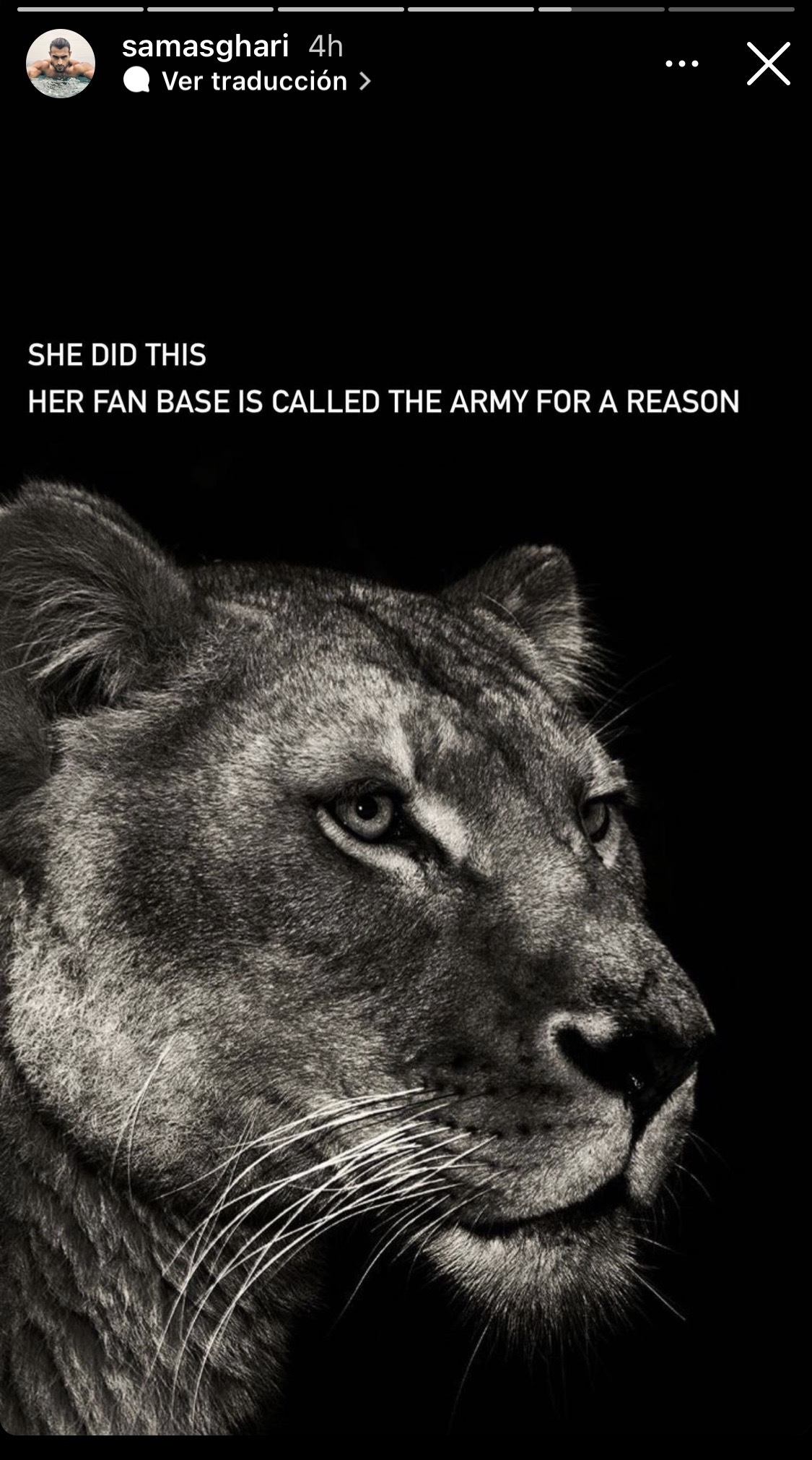 Finalmente, se refirió a los seguidores de su pareja. "Ella lo hizo. Su fanaticada es llamada el ejército por una razón", manifestó junto a la imagen de una leona.