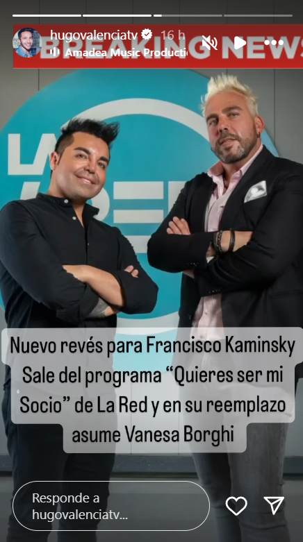 "Nuevo revés para Francisco Kaminski. Sale del espacio Quieres Ser Mi Socio y en su reemplazo asume Vanesa Borghi", escribió Valencia en la sección de historias de su cuenta de Instagram.